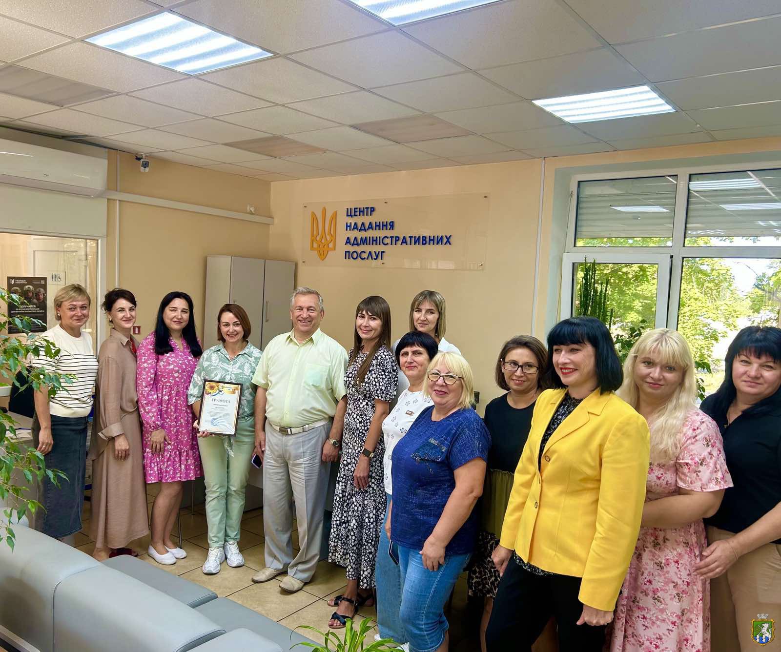 З цієї нагоди міський голова Валерій Онуфрієнко завітав до ЦНАП Південноукраїнської міської ради, щоб привітати колектив та вручити почесну грамоту від начальника Вознесенської районної військової адміністрації Олександра Кукурузи.