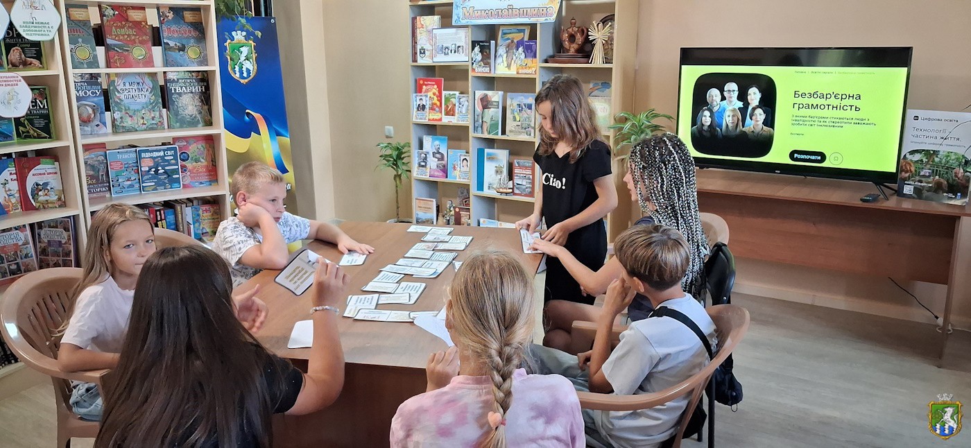 Під час години спілкування завідувач бібліотеки Олена Прокопенко ознайомила присутніх із освітнім серіалом «Безбар’єрна грамотність», який вчить про поняття безбар’єрності в суспільстві: вчитися разом з усіма, отримувати інформацію, рухатися вільно, бути частиною суспільних змін, орієнтуватися в онлайн-послугах і працювати без бар’єрів. Щоб закріпили свої знання діти пограли у тематичну гру-домінушку та зробили об’ємну аплікацію.
