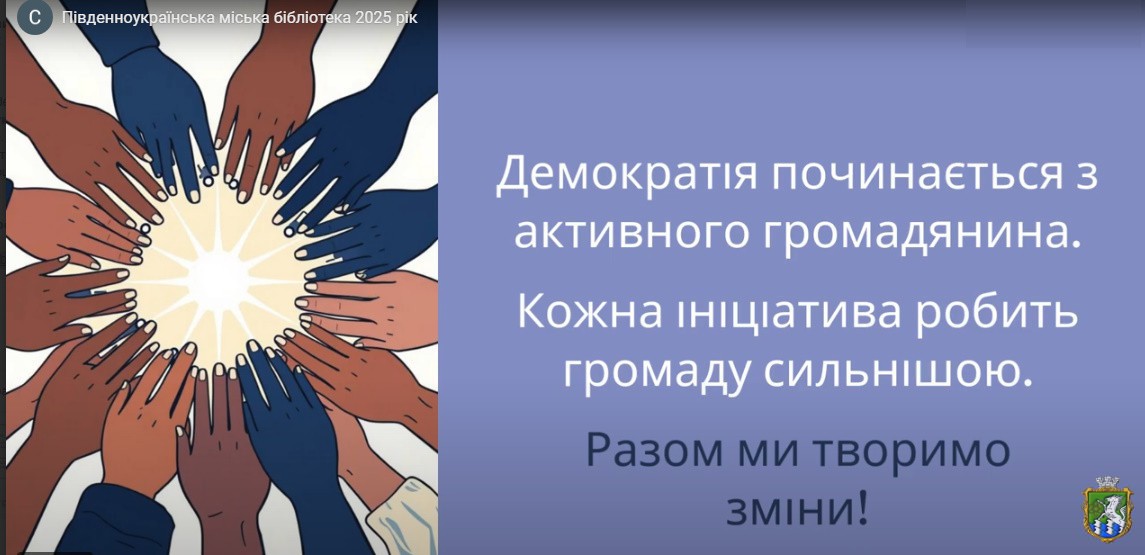 В рамках Тижня громадянського суспільства 2025 Південноукраїнська міська бібліотека підготувала презентацію віртуальної виставки «Демократія та громадянські ініціативи».